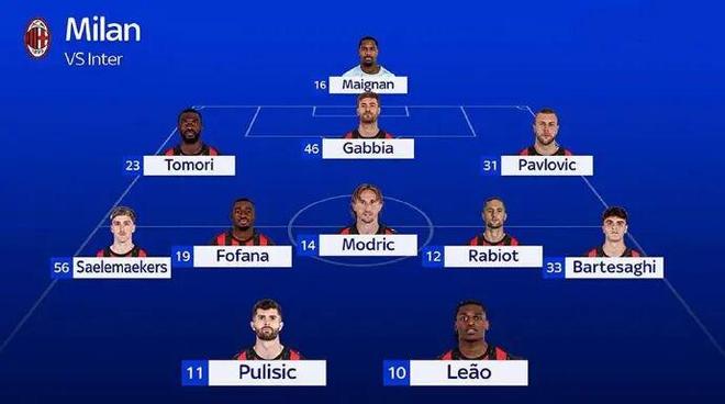 米兰(3-5-2阵型):迈尼昂;托莫里,加比亚,帕夫洛维奇;萨勒马科尔斯,福法纳,莫德里奇,拉比奥特,巴特萨吉;普利西奇,莱奥。