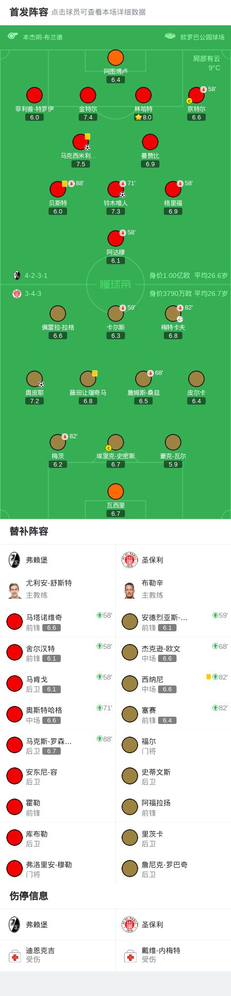 - 弗赖堡2-1圣保利,马克西米利安-埃格施泰因、铃木唯人破门