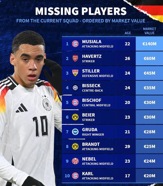 此次未入选德国队大名单身价前10:穆西亚拉领衔,哈弗茨在列